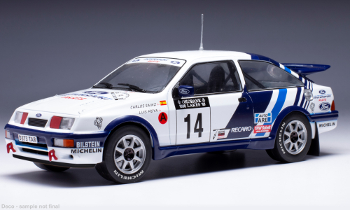 A quality model of the Ford Sierra RS Cosworth rally sports car driven by C. Sainz and L. Moya. In 1988 it made a strong showing at the 1000 Lakes Rallye. This iconic rally car, which adorned the number 14, demonstrated its exceptional performance and precision on the demanding rally stages. With its rich racing history and powerful design, the Ford Sierra RS Cosworth continues to captivate motorsports enthusiasts around the world.