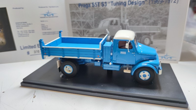 Limitovaný resinový model Praga S5T S3 "Tuning dizajn" 1969 -1972 v mierke 1:43 v počte 333 ks od svetoznámeho výrobcu AutoCult. Model je dodávaný v PVC boxe na podstavci a s brožúrkou, ktorá je číslovaná od 1 po 333ks.